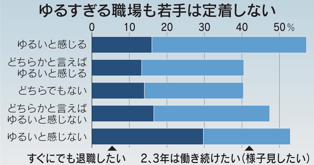職場を「ゆるい」と感じる若手社員の16%が「すぐにでも退職したい」と答え、41%が「2、3年は働き続けたい」と退職も念頭に様子見をするとしています。